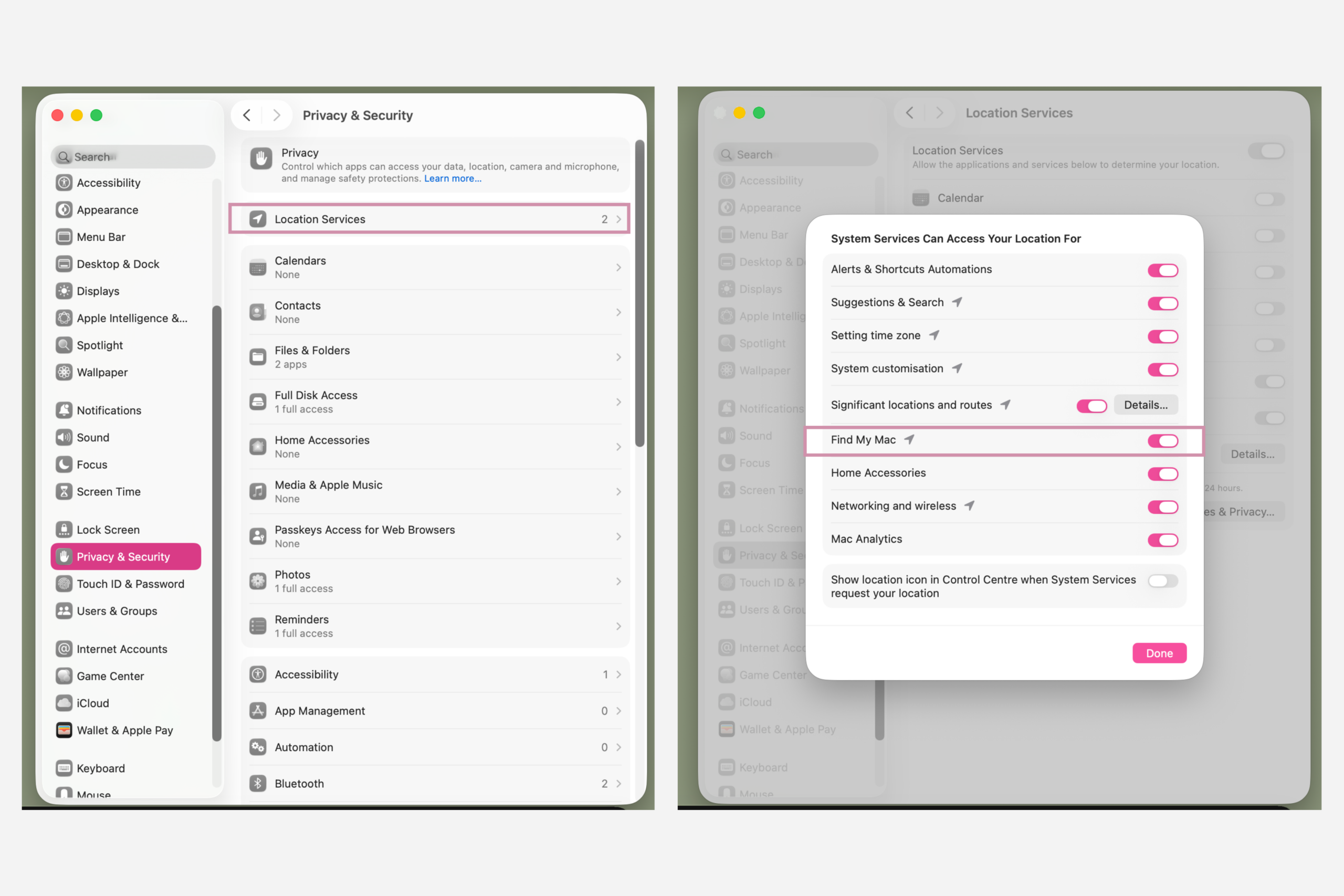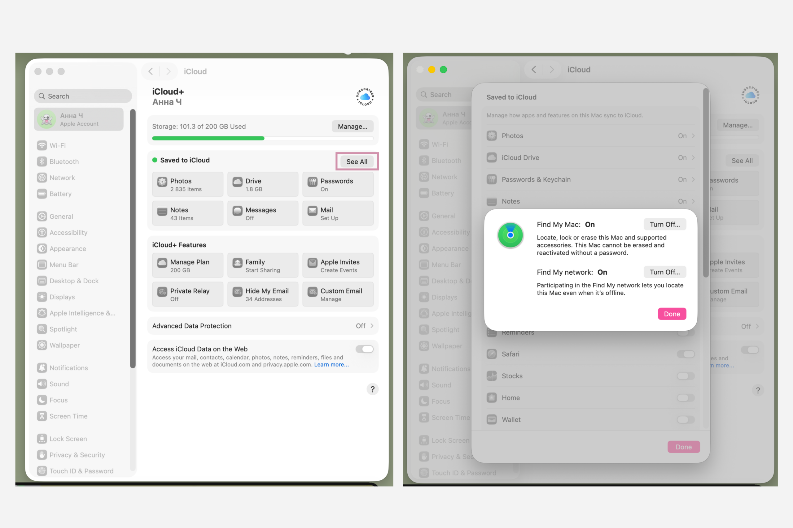 Agar qurilmani internetga ulanmagan holatda ham qidirish imkonini saqlamoqchi bo‘lsangiz, Find My network funksiyasini ham yoqib qo‘ying. Bu yordamida MacBook’ning oxirgi yoki taxminiy joylashuvini ko‘rish mumkin bo‘ladi.