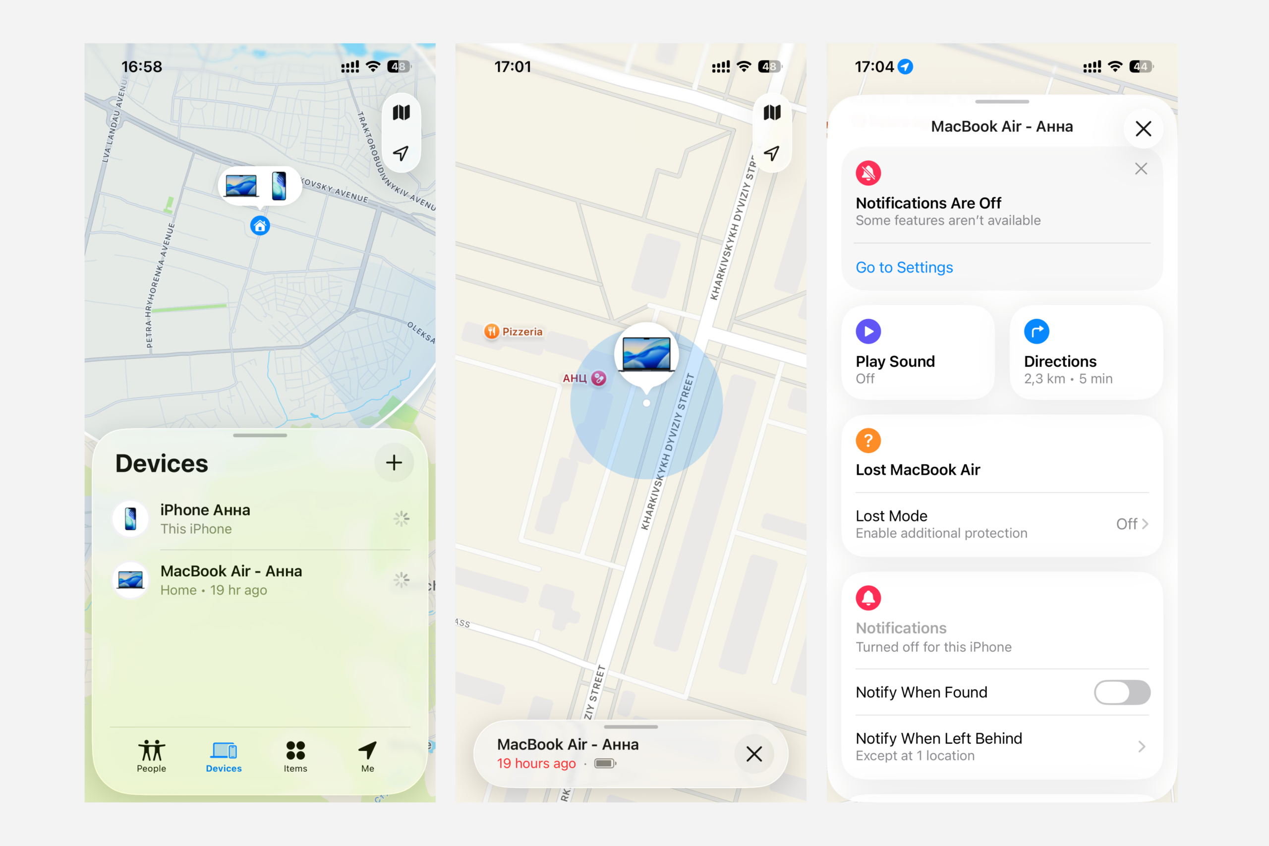 Shuningdek, yo‘qolgan qurilmani boshqa Apple qurilmasi orqali ham topish mumkin. Buning uchun Find My ilovasini oching, Devices bo‘limini tanlang, kerakli qurilmani ko‘rsating va uning joylashuvini kuzating.