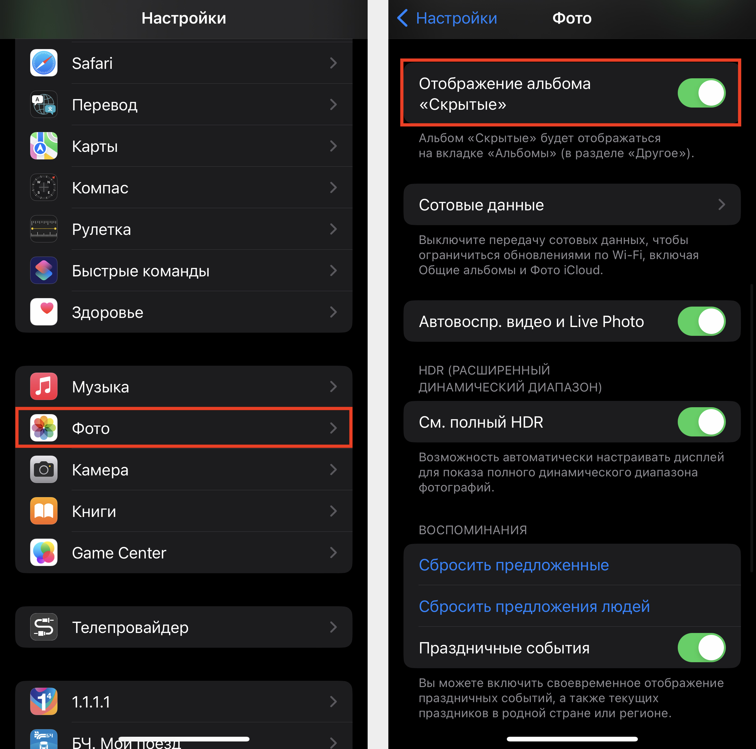 Важно: после этих действий скрытые фото не будут отображаться в общей медиатеке. Для большинства сценариев этих мер безопасности достаточно. Но если ваш смартфон попадет в руки человека, который сам пользуется iPhone, то он может заинтересоваться папкой «Скрытые» в приложении «Фото». А разблокировать ее можно с помощью ввода код-пароля.