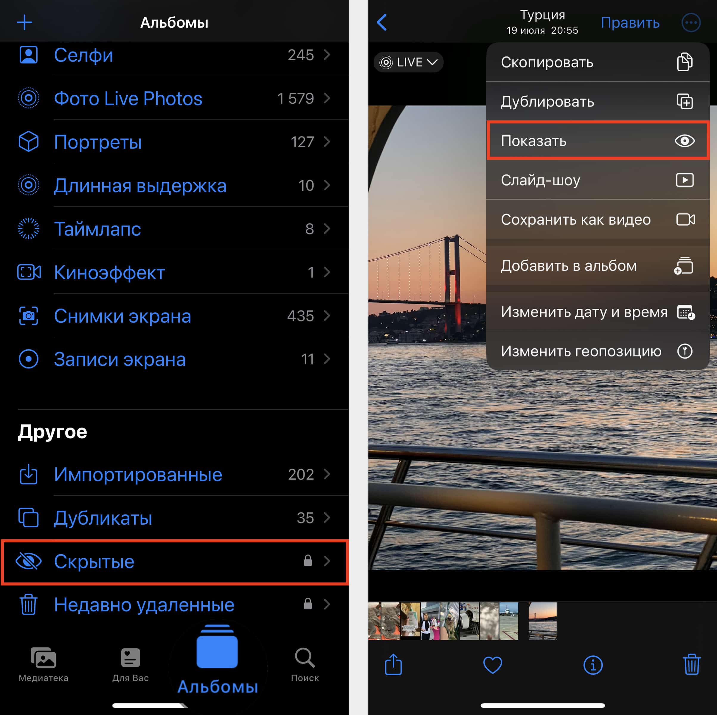 Чтобы найти его, нужно открыть приложение «Фото» и перейти в меню «Альбомы». Затем пролистайте вниз и в блоке «Другое» увидите папку «Скрытые». Она запаролена: потребуется пройти аутентификацию Face ID/Touch ID или ввести код-пароль.