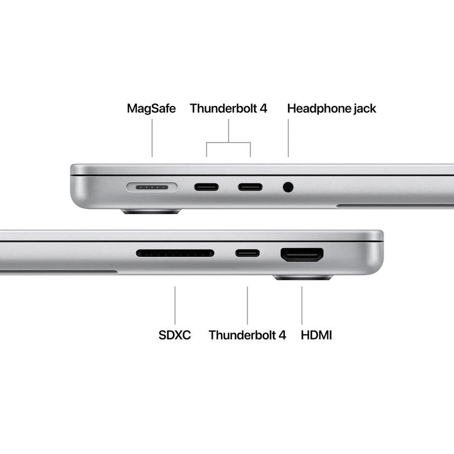 - CONNECT IT ALL—The 14-inch MacBook Pro features three Thunderbolt 4 ports, a MagSafe 3 charging port, SDXC card slot, HDMI port, and headphone jack. And it supports up to two external displays.