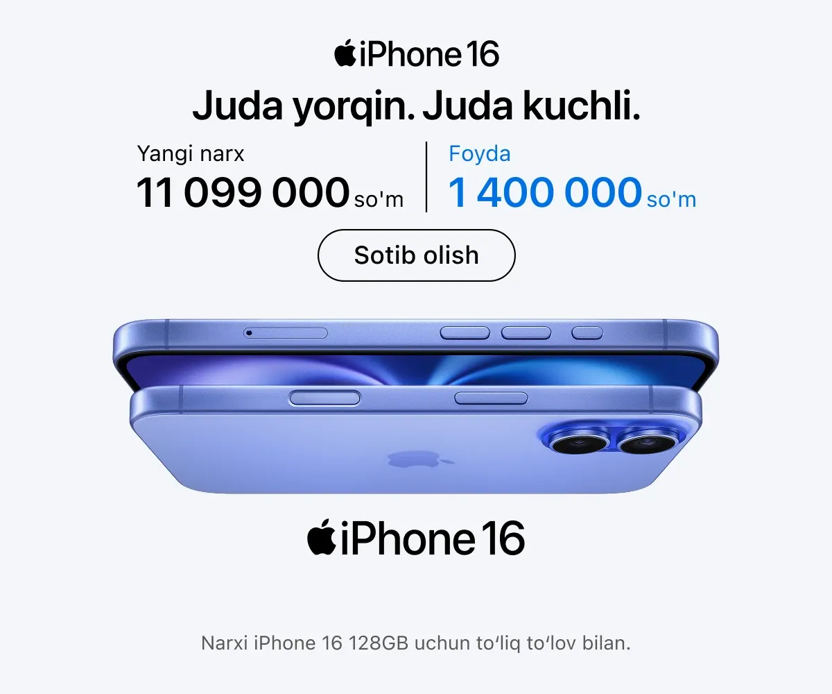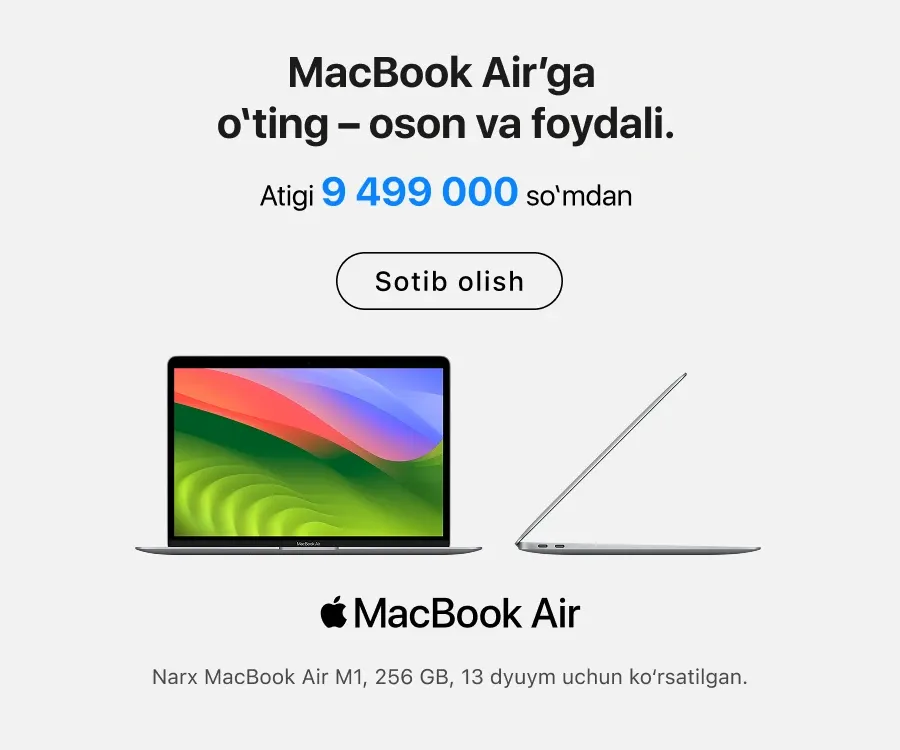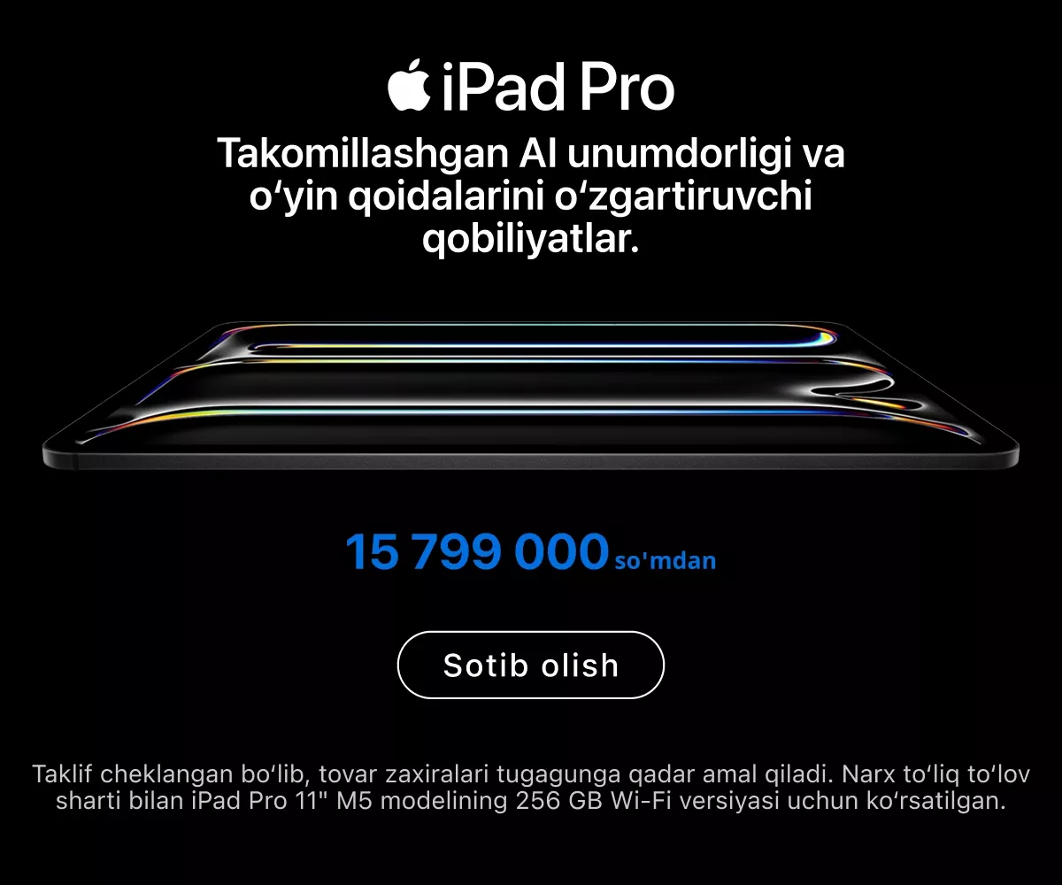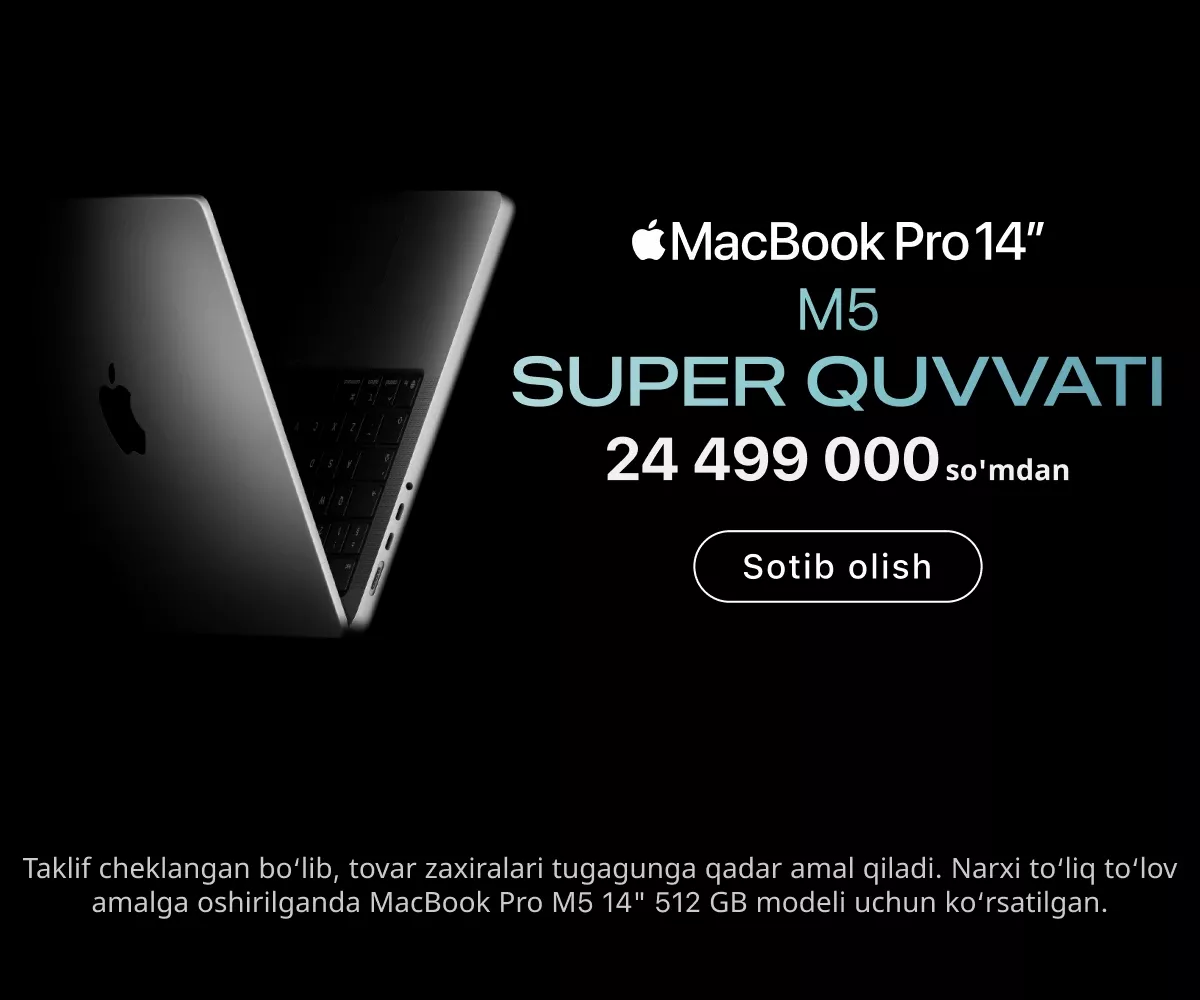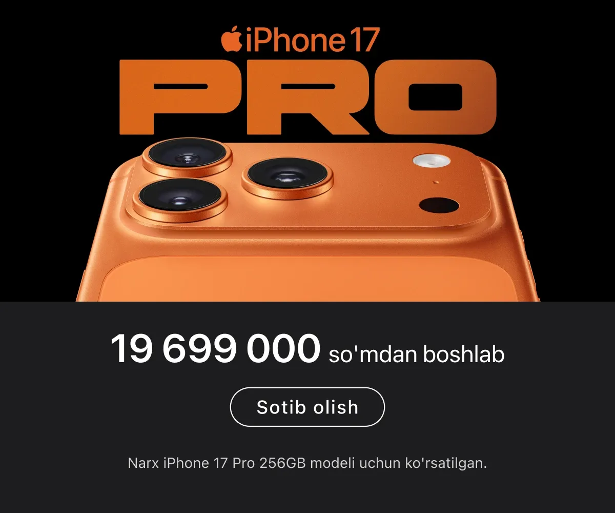 iSpace’da faqat rasmiy Apple qurilmalari taqdim etiladi – bu yerda siz turli toifadagi eng so‘nggi qurilmalarni topasiz. Masalan, oxirgi seriyadagi yangi iPhone, kundalik foydalanish yoki murakkab grafikalar ustida ishlash uchun MacBook. Agar haqiqiy professional studiya yaratmoqchi bo‘lsangiz, Mac Studio va Studio Display yordamida kuchli ish stansiyasini yig‘ishingiz mumkin.