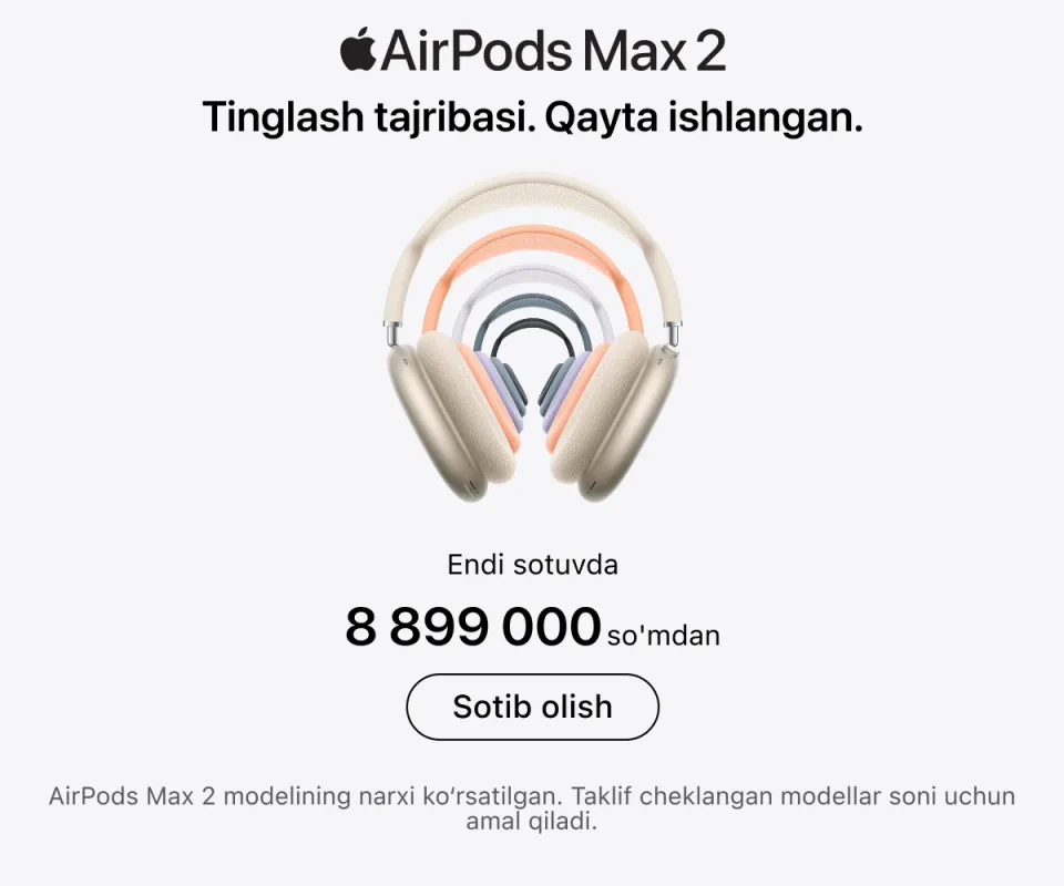iSpace’da faqat rasmiy Apple qurilmalari taqdim etiladi – bu yerda siz turli toifadagi eng so‘nggi qurilmalarni topasiz. Masalan, oxirgi seriyadagi yangi iPhone, kundalik foydalanish yoki murakkab grafikalar ustida ishlash uchun MacBook. Agar haqiqiy professional studiya yaratmoqchi bo‘lsangiz, Mac Studio va Studio Display yordamida kuchli ish stansiyasini yig‘ishingiz mumkin.