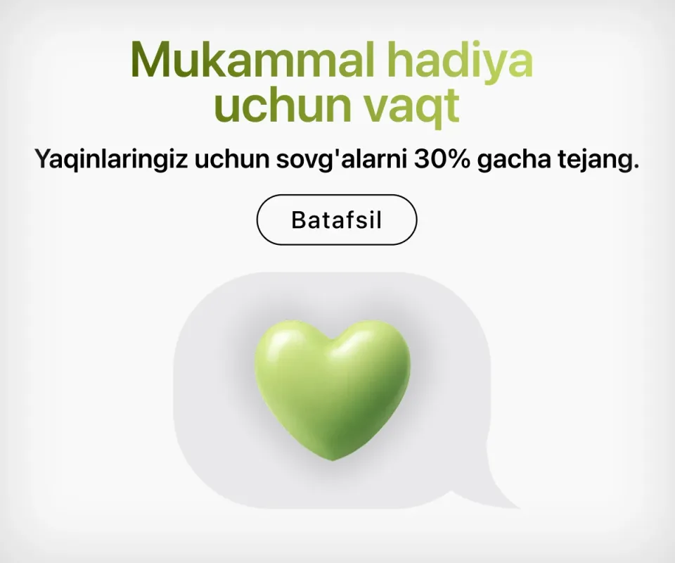 - · Qulay sodiqlik dasturi – har bir xarid uchun bonus yig‘ing (3% gacha pul qaytarimi) va keyingi xarid summasining 30% gacha qismini ular bilan to‘lang.