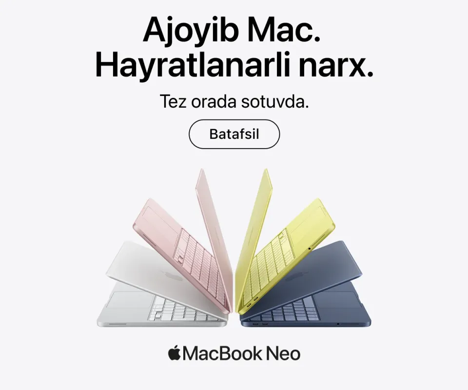 iSpace’da faqat rasmiy Apple qurilmalari taqdim etiladi – bu yerda siz turli toifadagi eng so‘nggi qurilmalarni topasiz. Masalan, oxirgi seriyadagi yangi iPhone, kundalik foydalanish yoki murakkab grafikalar ustida ishlash uchun MacBook. Agar haqiqiy professional studiya yaratmoqchi bo‘lsangiz, Mac Studio va Studio Display yordamida kuchli ish stansiyasini yig‘ishingiz mumkin.
